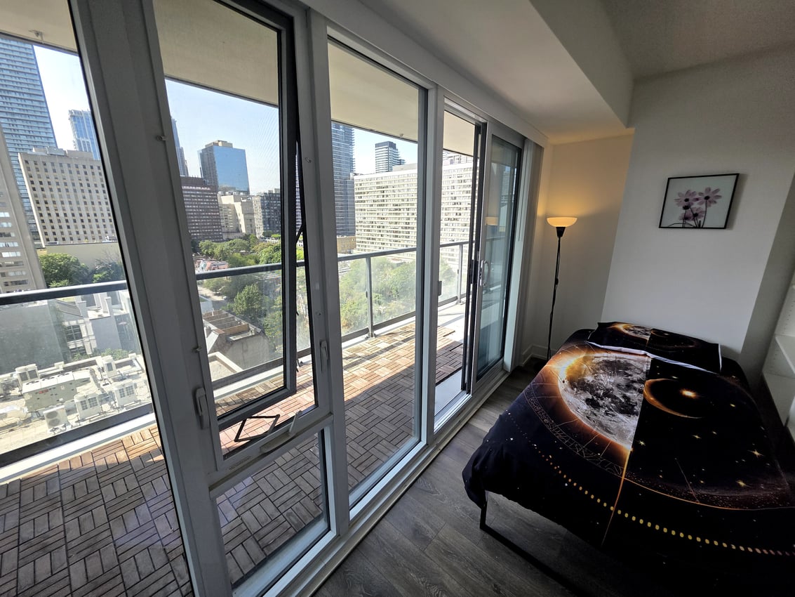 The Flex Room with Balcony, located in our apartment at the bustling intersection of McGill Street & Church Street, provides a versatile and affordable living option in the heart of Toronto. Furnished with a twin-sized bed, nightstand, this room is ideal for students or professionals seeking both comfort and practicality. The private balcony adds an extra touch, offering residents their own outdoor space to relax and enjoy views of the city.