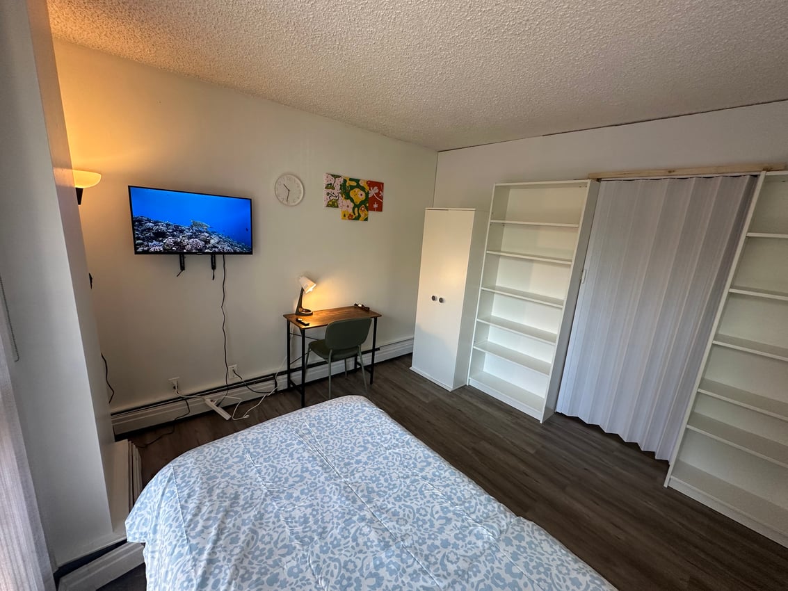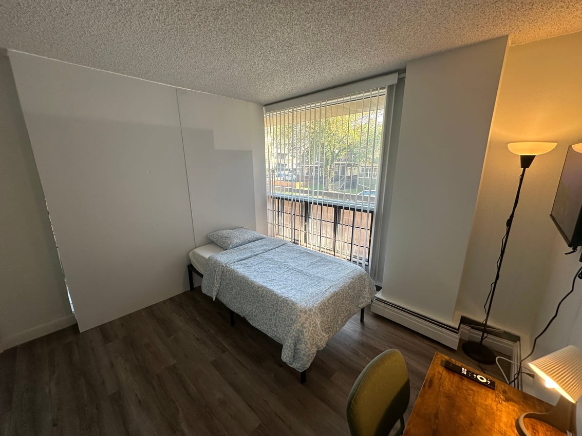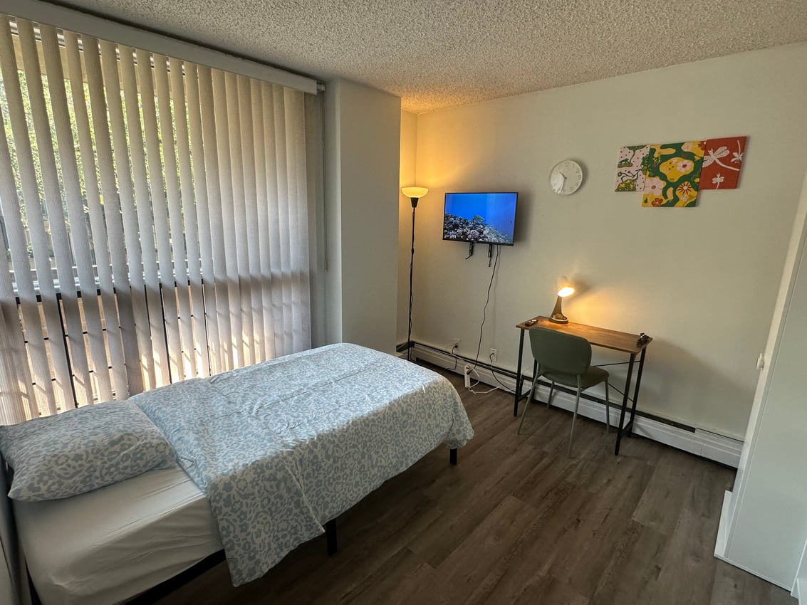 Our Flex Room at 1228 13 Ave SW in Calgary offers a versatile and comfortable living space perfect for students, young professionals, or anyone seeking an affordable yet functional room in a central location. This flexible layout allows the room to be used as a bedroom, study area, or a hybrid living space. It comes furnished with a full-size bed, study desk, nightstand, and a 40-inch Smart TV. Large windows provide plenty of natural light, creating a bright and welcoming atmosphere. Residents share access to the main shared bathroom with a shower within the apartment.