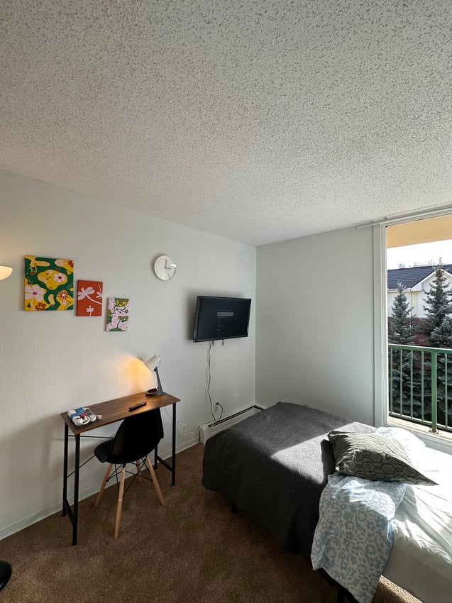 Our Flex Room with Balcony at 510 21 Ave SW in Calgary offers a versatile and comfortable living space perfect for students, young professionals, or anyone needing a flexible room layout. This room can function as a bedroom, study area, or hybrid living space and comes fully furnished with a full-size bed, study desk, nightstand, and a 40-inch Smart TV. Large windows and direct access to a private balcony provide abundant natural light and a pleasant outdoor spot for relaxing or enjoying city views. Residents share access to the main shared bathroom with a shower within the apartment.