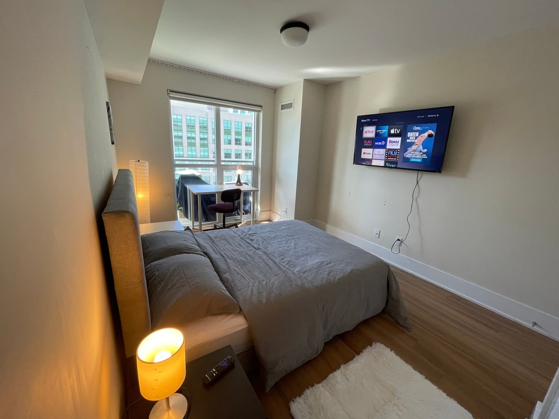 Our Front Street West & John Street apartment's Deluxe Room offers a blend of practicality and comfort, ideal for those seeking a budget-friendly option in downtown Toronto. The room includes essential furnishings like a full-size bed, study desk, nightstand, and a 40-inch Smart TV. Enjoying ample natural light from its large windows, this room provides a cozy, no-frills living space. Note that a private ensuite bathroom is not included, but residents have access to shared bathroom facilities.