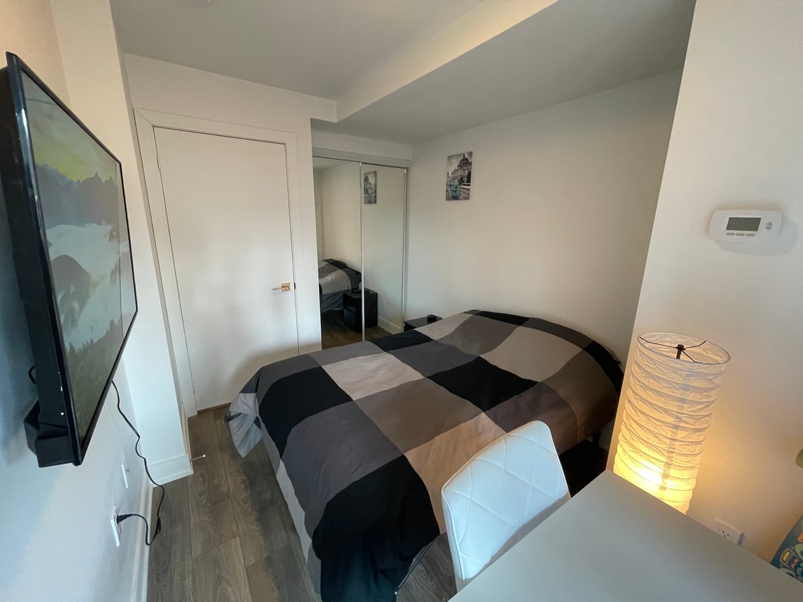 The Deluxe Room, situated in our apartment at the bustling intersection of McGill Street & Church Street, combines comfort with practicality in the heart of Toronto. This efficiently furnished room includes a full-size bed, study desk, nightstand, and a modern 40-inch Smart TV, perfect for individuals looking for a functional and cozy living space. Large windows allow plenty of natural light to brighten the room, offering views of the lively urban surroundings.