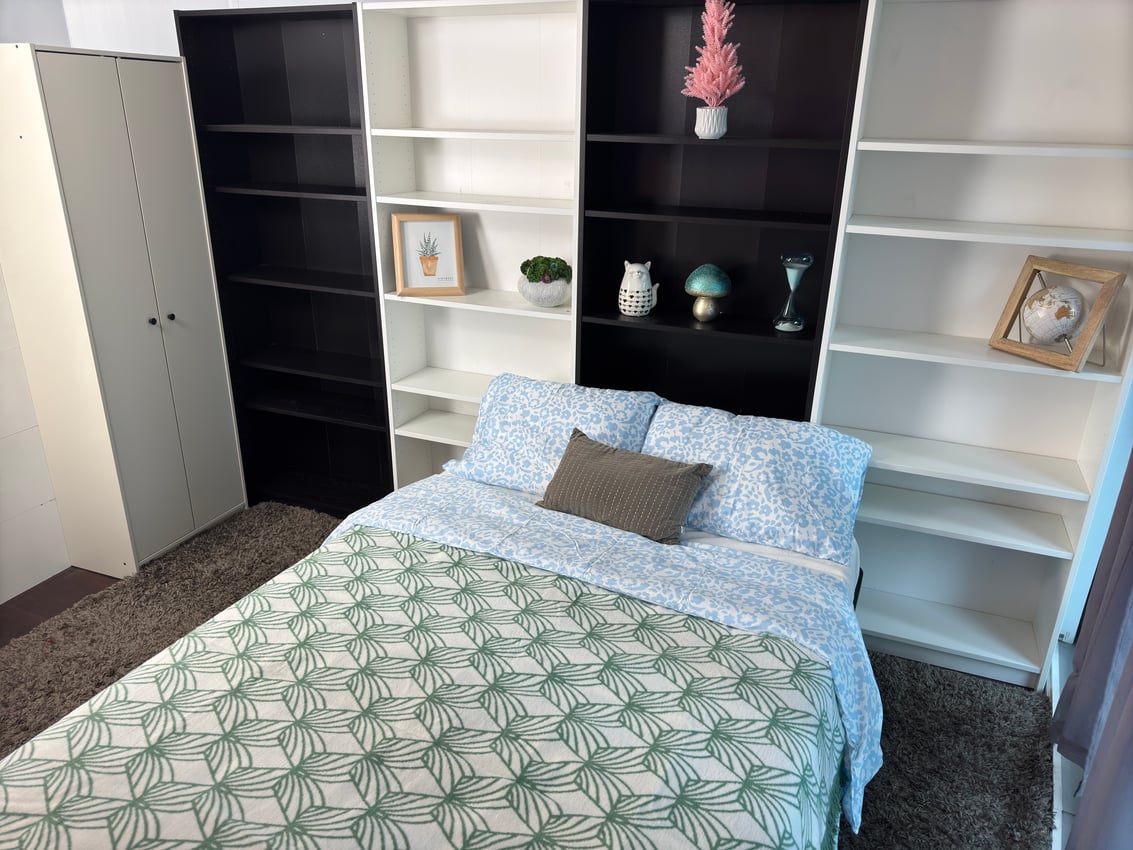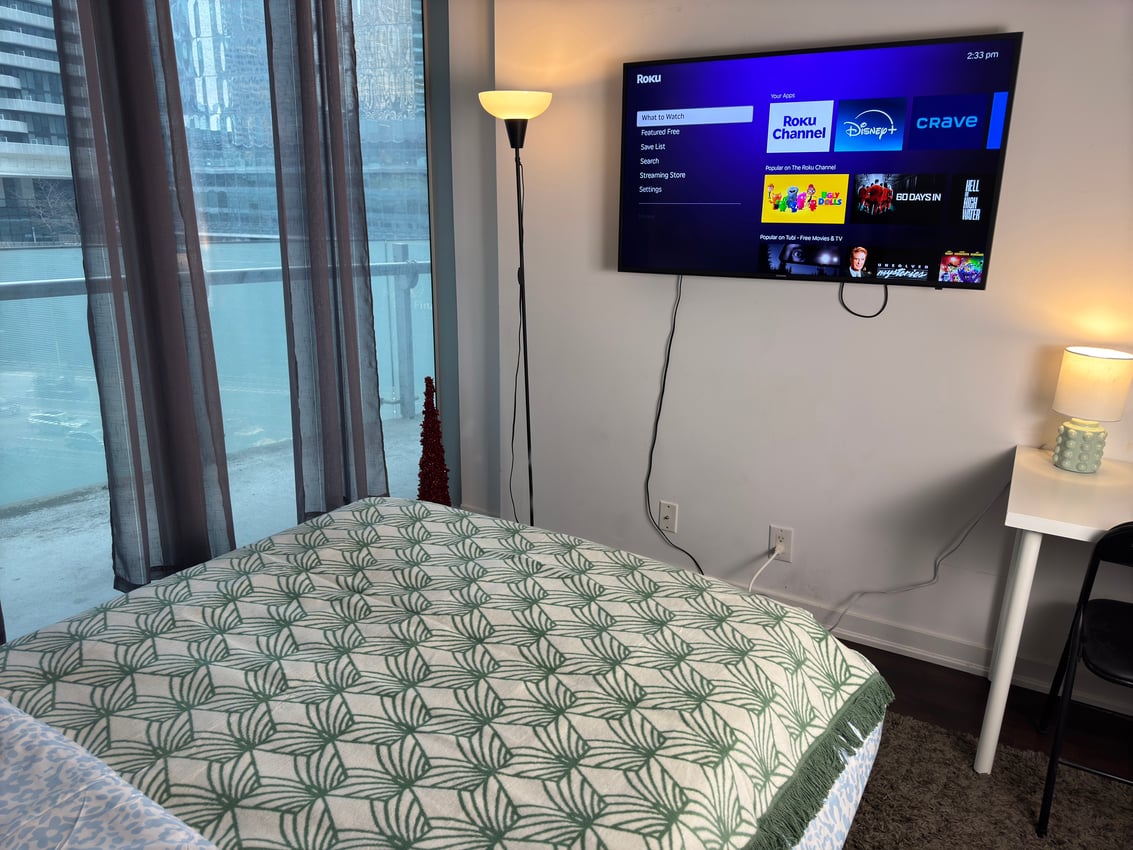 The Flex Room with Balcony, situated in our apartment at the bustling intersection of York Street & Bremner Boulevard, combines comfort with practicality in the heart of Toronto. This efficiently furnished room includes a full-size bed, study desk, nightstand, and a modern 40-inch Smart TV, perfect for individuals looking for a functional and cozy living space. Large windows allow plenty of natural light to brighten the room, and the private balcony offers views of the lively urban surroundings.