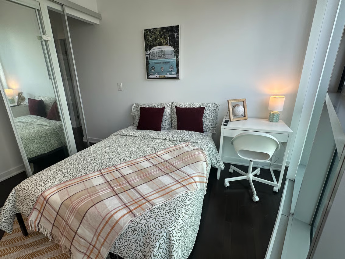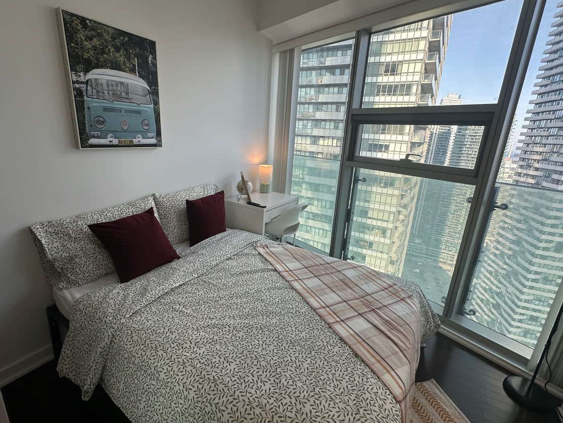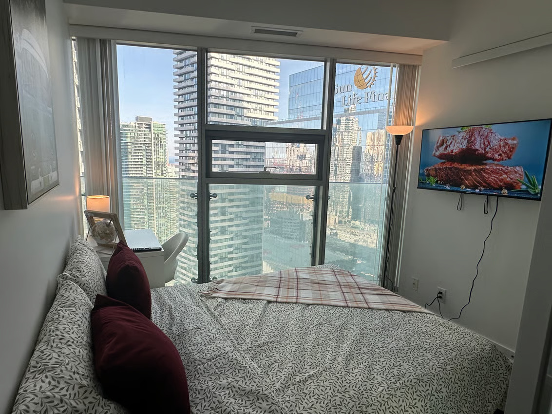 The Deluxe Room, situated in our luxury condo at the prime intersection of York St & Harbour St, embodies the epitome of elegance and sophistication in downtown Toronto. This fully furnished room is equipped with a 40-inch Smart TV, full-size bed, study desk, nightstand, catering to all your entertainment and comfort needs. Designed for those who seek a blend of luxury and functionality, the room is bathed in natural light from large windows.